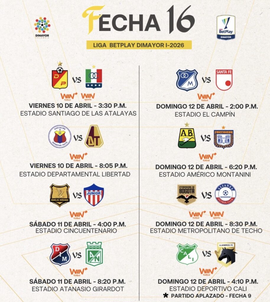 Ya están confirmadas los partidos que se jugarán este fin de semana por la fecha 16 de la liga BetPlay hasta el próximo domingo 12 de abril.