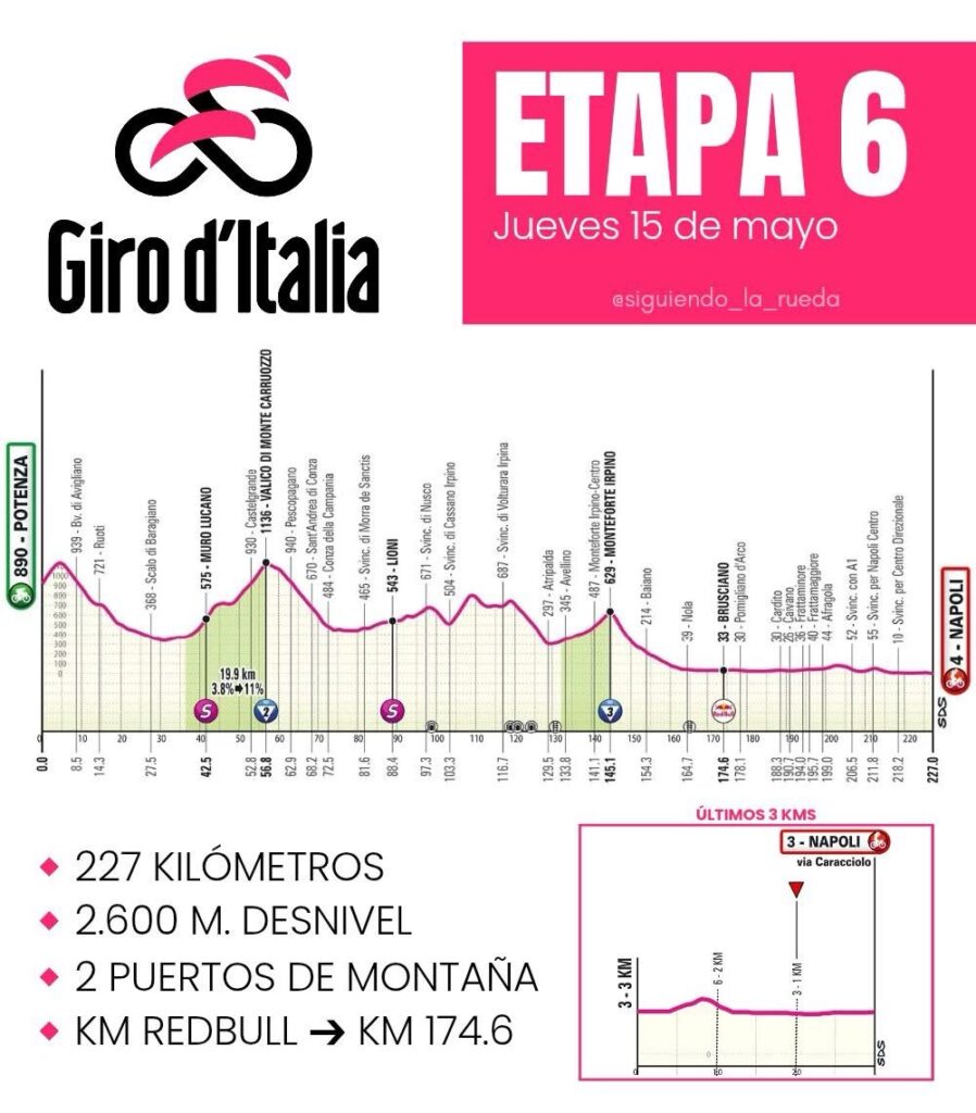 La ronda italiana continuará este jueves con la sexta etapa, que llevará a los pedalistas de Potenza hasta Napoli a lo largo de 227 kilómetros con dos puerto de montaña categorizados y final en llano ideal para los sprinter.