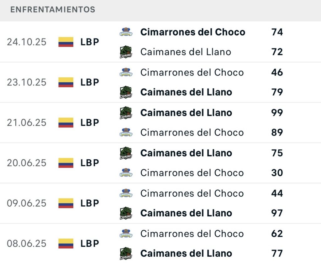 Caimanes del Llano y Cimarrones del Choco se enfrentaron en seis oportunidades por la liga profesional, con cinco victorias a favor de Caimanes y una derrota.