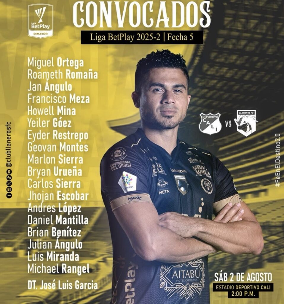 Llaneros FC se medirá este sábado a Deportivo Cali en la continuidad de la fecha 5 de la Liga Betplay 2025-II en un duelo que se disputará en el estadio Palmaseca desde las 2:00 p.m.