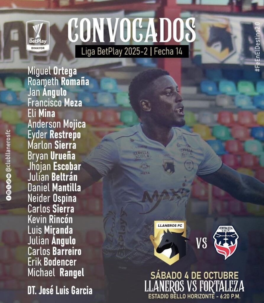 ALINEACIÓN DE LLANEROS PARA EL PARTIDO DE LA FECHA 14 DE LA LIGA BETPLAY 2025-I