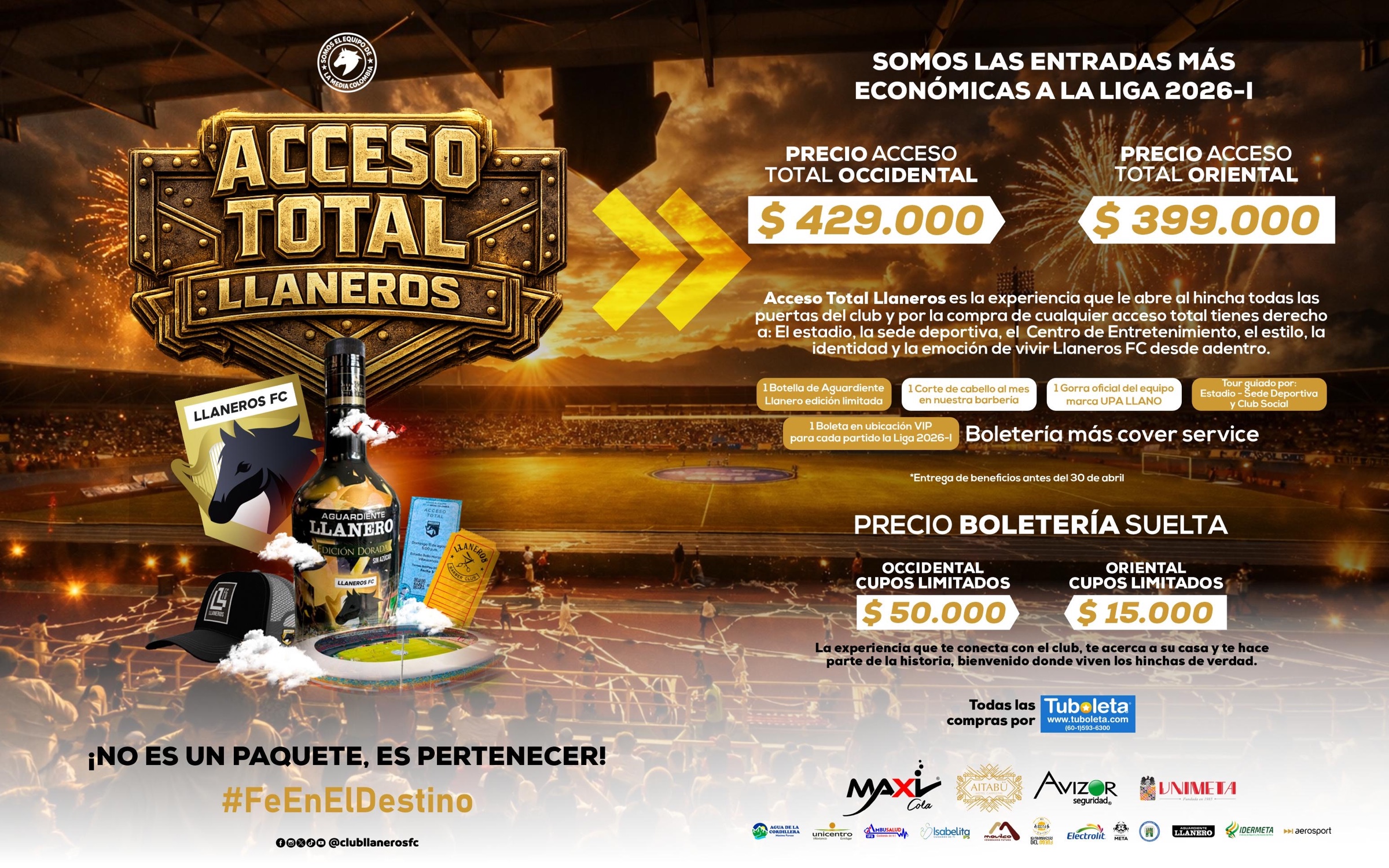 Quienes adquieran Acceso Total Llaneros tendrán ingreso garantizado a todos los partidos de local del equipo en la Liga BetPlay 2026-I, en tribuna Occidental VIP u Oriental VIP, convirtiéndose en las entradas más económicas del torneo, con valores históricos por partido.