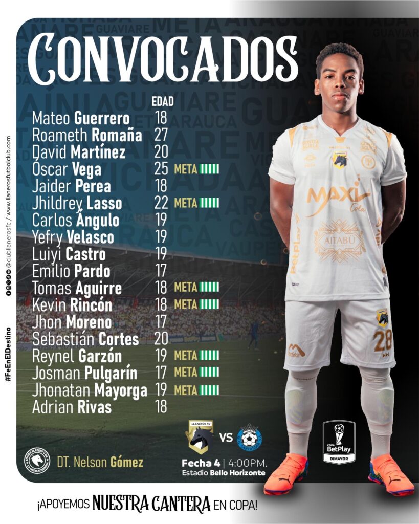 El onceno llaneros sigue jugando con la cantera, promoviendo jugadores, su técnico Nelson Gómez convocó básicamente los mismos jugadores con la que a enfrentado la Copa Colombia, en Santa Marta, jugará en busca de lograr los tres puntos y tener alguna posibilidad de pasar a la segunda fase.