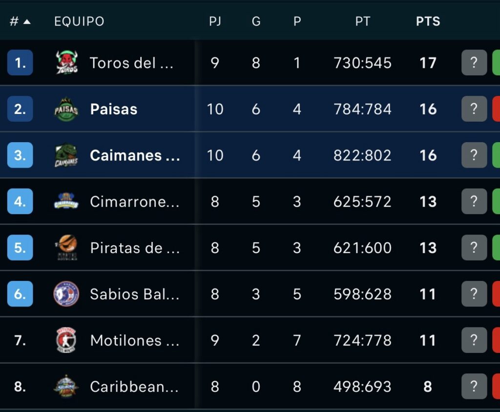 Con estos resultados la tabla la sigue liderando Toros del Valle, seguido por Paisas y Caimanes, que tiene una diferencia a favor de 20 puntos, su próximo compromiso será contra los Sabios de Manizales el próximo lunes 4 de mayo.