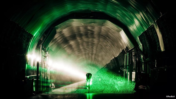 Las pruebas en el antiguo túnel ferroviario requerían una concentración absoluta. Los corredores completaron más de 100 carreras a la misma velocidad, posición y trayectoria, atravesando cada vez esa cortina verde de burbujas de helio y luz láser.