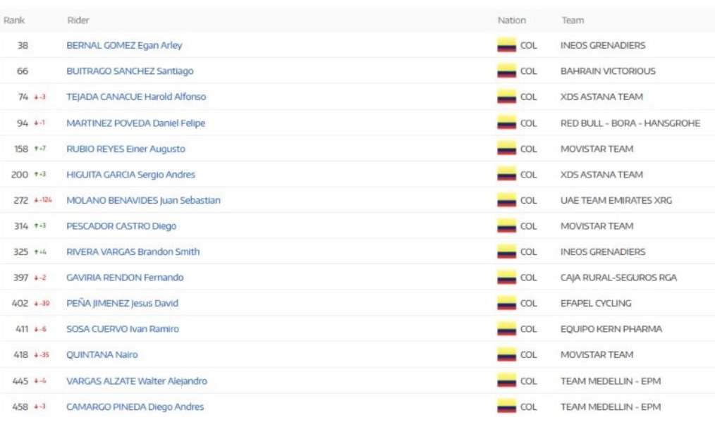 En cuanto a los colombianos, el más destacado del escalafon siguió siendo Egan Bernal, quien conservó la casilla 38°. Le siguen Santiago Buitrago en la posición 66° y Harold Tejada en el puesto 74°.