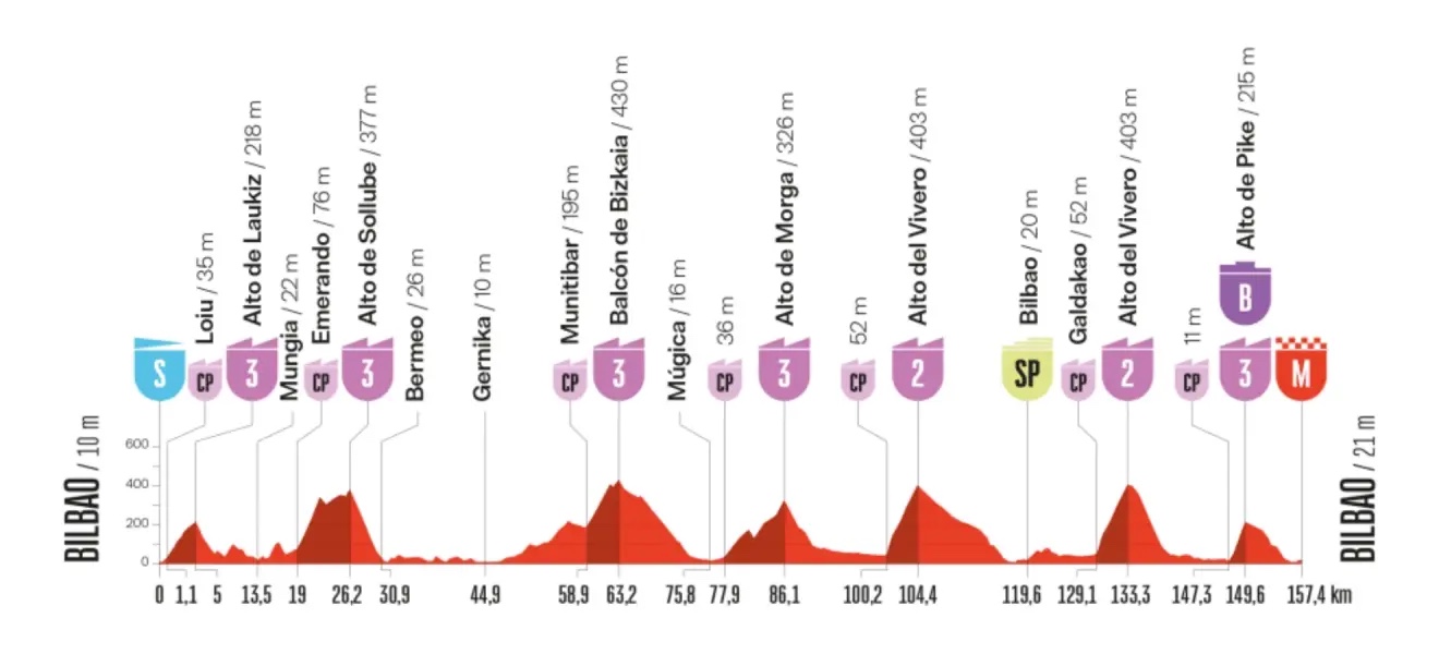 La salida neutralizada parte de Bilbao, pero la carrera se lanza rápido con el primer paso por Laukariz y un encadenado inicial que incluye el Alto de Laukiz y el Alto de Sollube, con rampas duras que podrían animar la formación de la fuga del día.